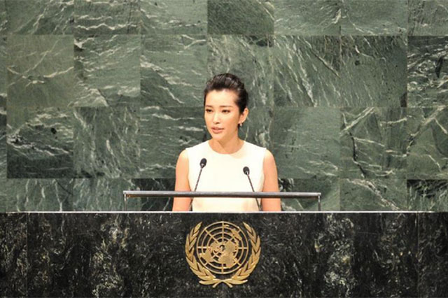 Li Bingbing, a Chinese actress and UN Environment Programme Goodwill Ambassador, spoke during the opening ceremony of the climate summit at UN headquarters in New York on Sept 23, 2014. She deeply cares about climate change and is keen to see leaders take immediate action.