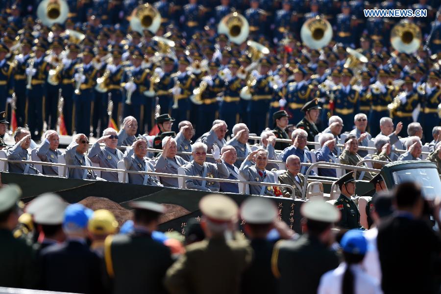 Veterans attend a parade in Beijing, capital of China, Sept. 3, 2015. China on Thursday held commemoration activities, including a grand military parade, to mark the 70th anniversary of the victory of the Chinese People's War of Resistance Against Japanese Aggression and the World Anti-Fascist War. (Xinhua/Wang Dingchang)