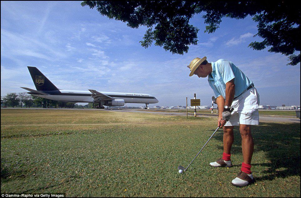 Don Mueang Airport in Bangkok, Thailand, has a golf course right next to its planes (pictured) where golfers could walk off the green and straight onto the tarmac