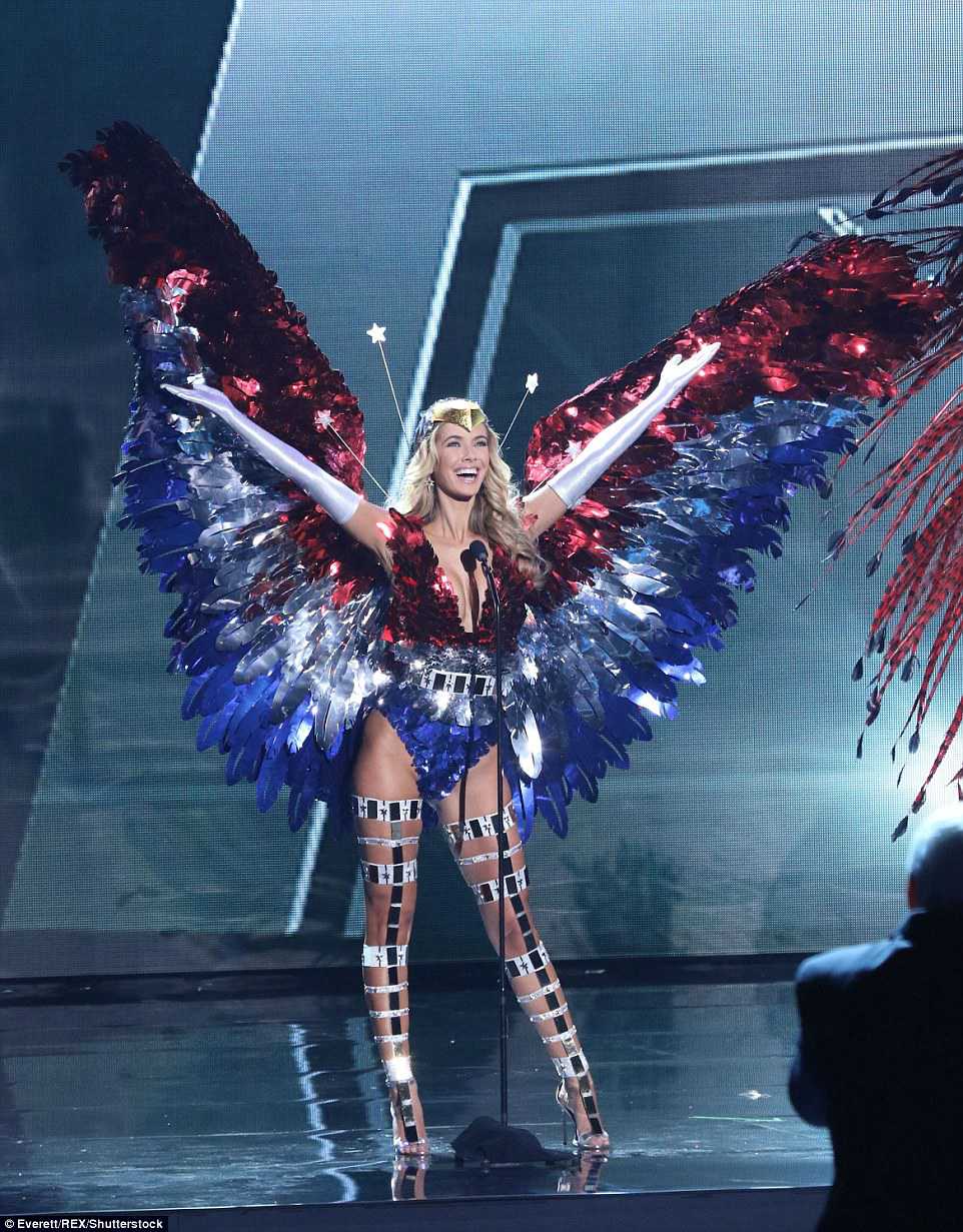 Miss USA and third runner up Olivia Jordan also put on a patriotic display, dressing as a red, white and blue bald eagle with wings that spanned eight feet in a costume designed by Adam Selman, who created Rihanna's infamous see-through dress.