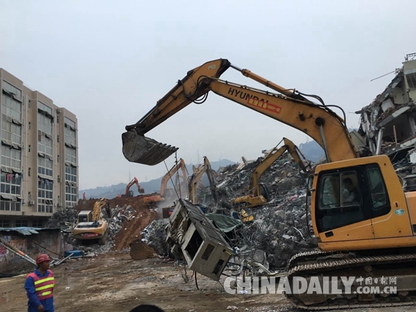 A rescue vehicle works on a debris of a factory building after a landslide occurred in Shenzhen. Strong signals of life have been detected on Monday. [Photo by Chai Hua/chinadaily.com.cn]