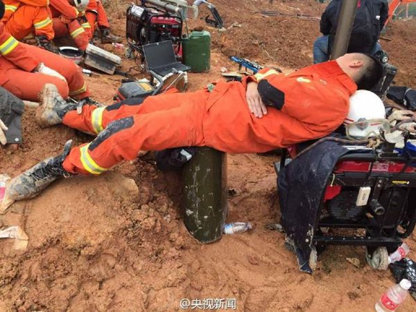 After days of continuous work, rescue workers and search dogs are exhausted. Journalist from CCTV took these pictures showing them taking a short rest between shifts. These photos move a lot of people on China’s social network. Chinese netizens express their gratitude towards rescuers’ hard work.