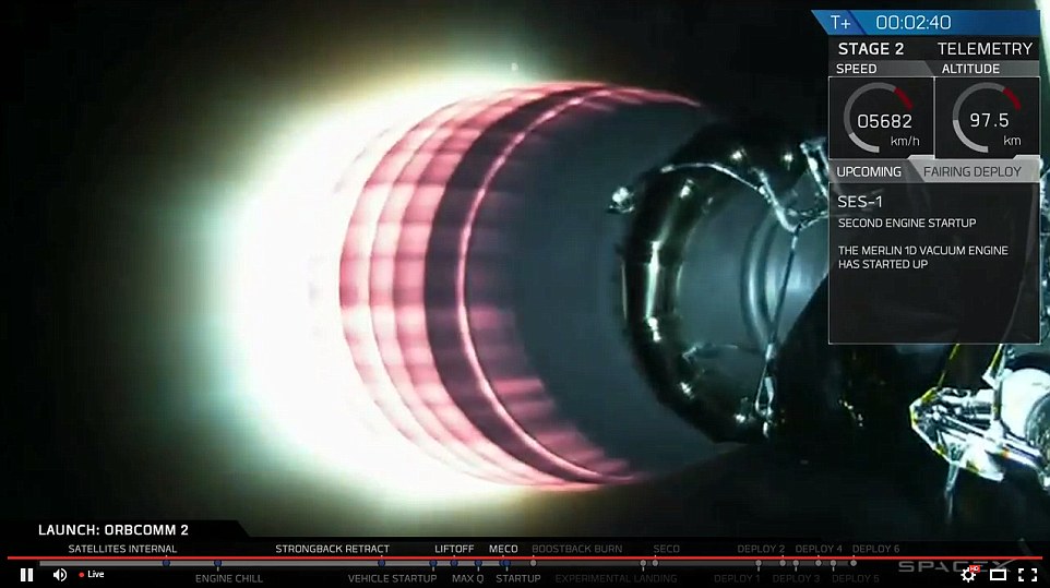 The first stage of the rocket was used to propel the payload to 62 miles (100km) into space, before the second stage took over. Pictured is the second engine start up