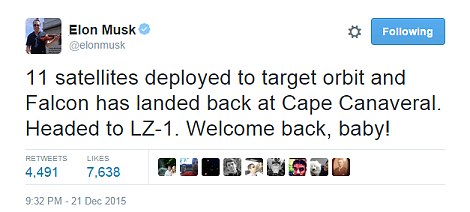He wrote: 'Just reviewed mission [parameters with] SpaceX team. Monte Carlo runs show [tomorrow] night has a 10 per cent higher chance of a good landing.'