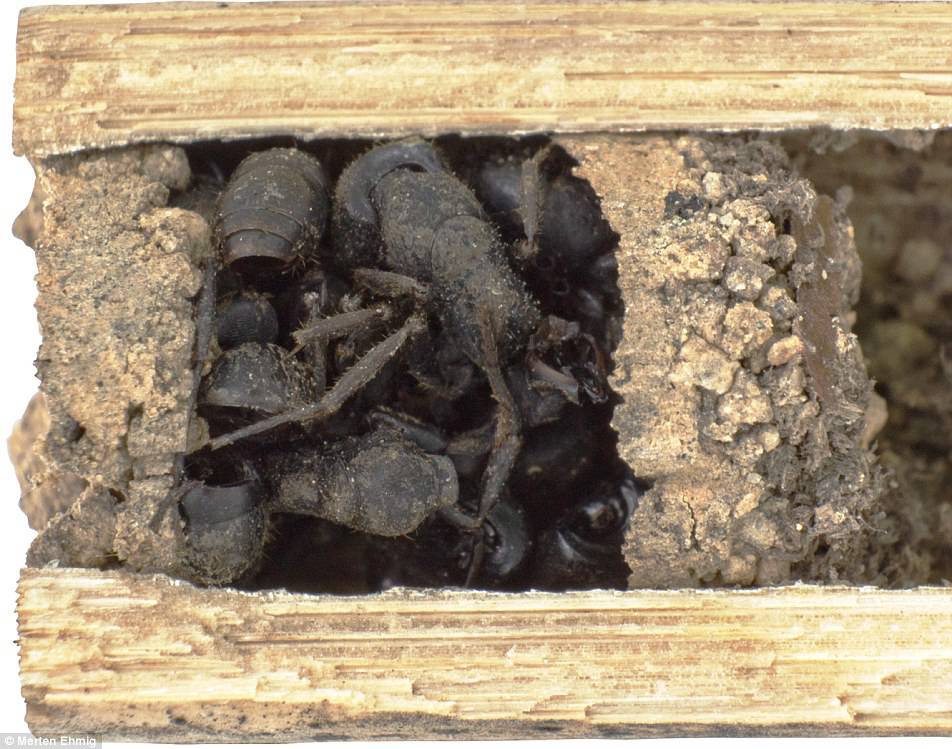 This close up image of the wasp's nest shows a cell filled with the bodies of dead ants that help to protect the cells behind it