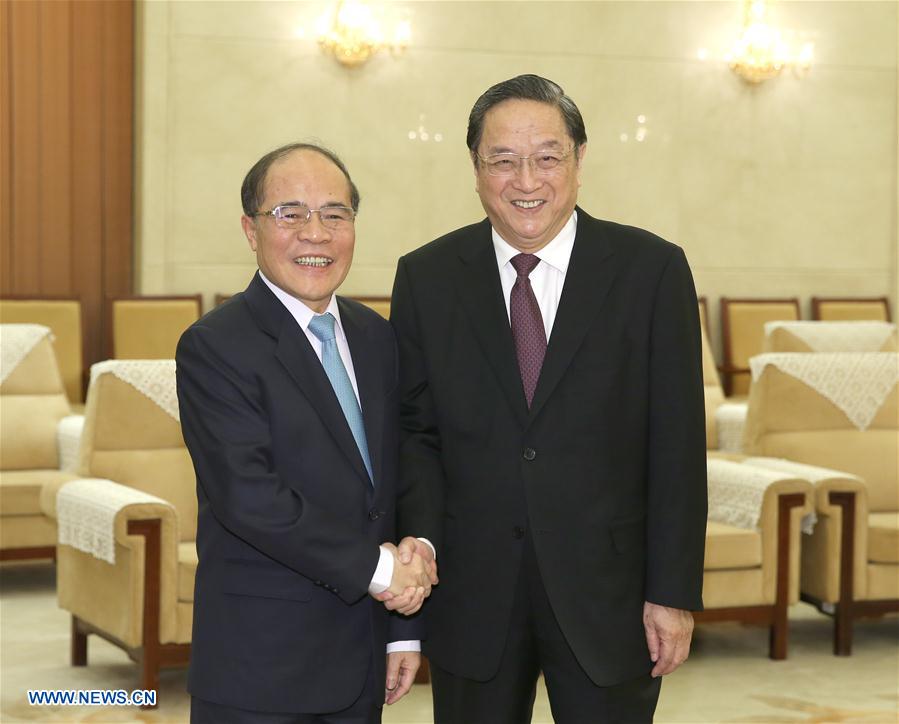 Yu Zhengsheng(R), chairman of the National Committee of the Chinese People's Political Consultative Conference, meets with Chairman of Vietnamese National Assembly Nguyen Sinh Hung in Beijing, capital of China, on Dec. 24, 2015. (Xinhua/Ma Zhancheng)