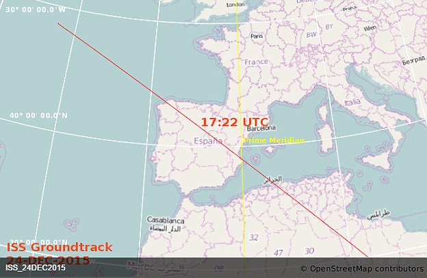 The ISS will be visible over the UK from around 5.20pm GMT and with the weather expected to be clear, there's a good chance of seeing it. It will pass over Spain (shown with the red line). The blog says: 'The closer you are located to the line on the map the closer the Space Station will fly overhead'
