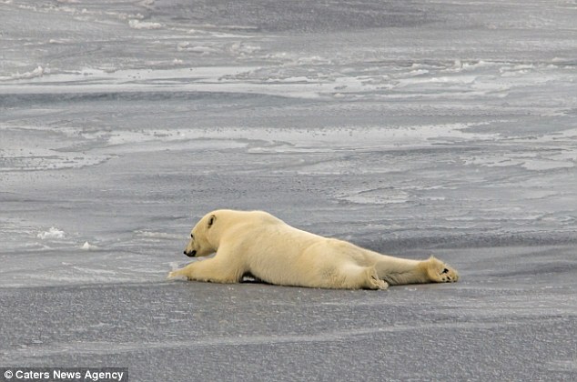 The polar bear lies on the ice having been unable to walk properly while spreading his weight
