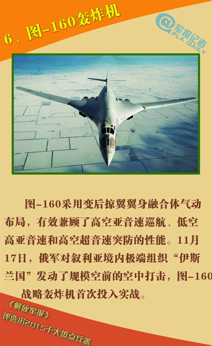 The Tupolev Tu-160 is a supersonic, variable-sweep wingheavy strategic bomber designed by the Tupolev Design Bureau in the Soviet Union. Although several civil and military transport aircraft are larger in overall dimensions, the Tu-160 is the world's largest combat aircraft, largest supersonic aircraft and largest variable-sweep aircraft built. On Nov. 17, 2015, Russia started using Tu-160 strategic long-range bombers against targets in Syria, along with Kalibr cruise missiles fired from the Mediterranean. This marked the combat debut of the Tu-160.