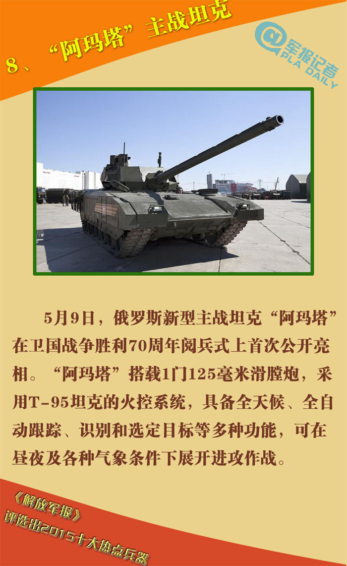 The T-14 Armata is a Russian 5th generation main battle tank based on the Armata Universal Combat Platform. It was first seen in public during rehearsals for the 2015 Moscow Victory Day Parade on May 9, 2015. Featuring a number of innovative characteristics, the T-14 represents a new generation of Russian main battle tanks. The most significant new feature is the use of an unmanned turret, with the crew of three seated in an armored capsule in the front of the hull.