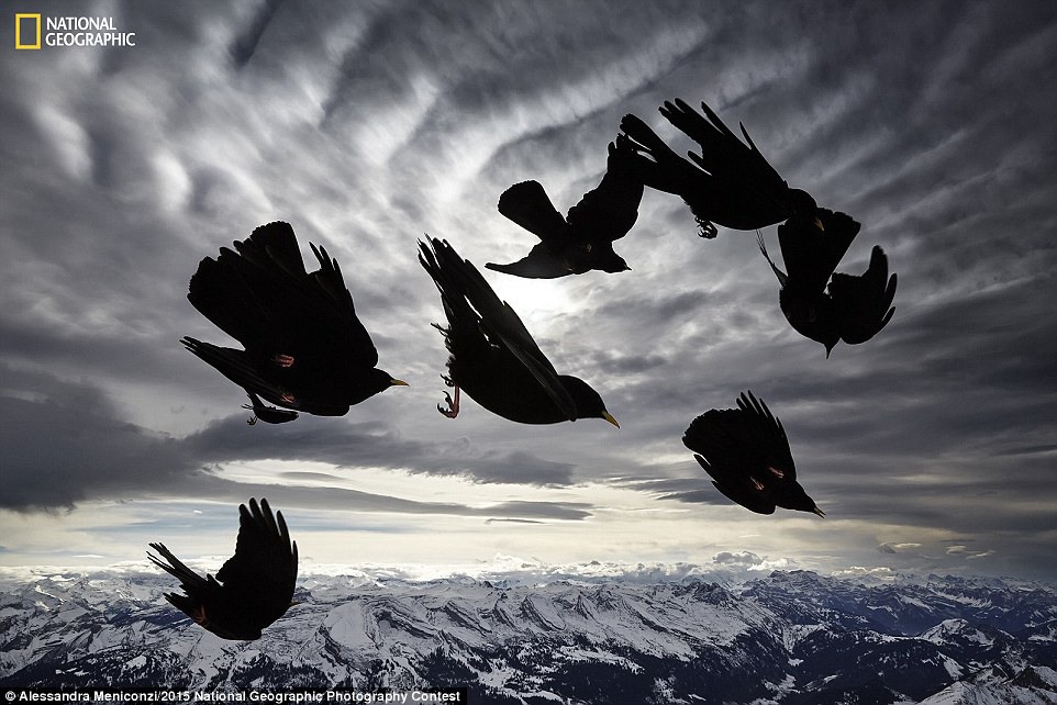 Alessandra Meniconzi. A flocks of Alpine choughs (Pyrrhocorax graculus), mountain-dwelling birds, performs acrobatic displays in the air. I was able, during a windy day, to immortalize their impressive flight skills