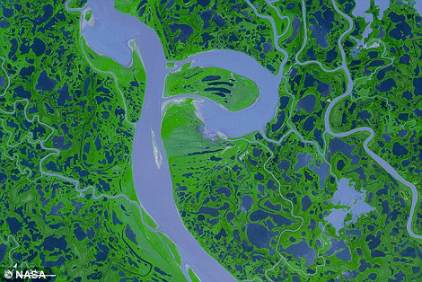 'P': The Advanced Spaceborne Thermal Emission and Reflection Radiometer (ASTER) sensor on the Terra satellite captured this false-color image of the Mackenzie River Delta in Canada (left). 'Q': the Advanced Spaceborne Thermal Emission and Reflection Radiometer (ASTER) on NASA’s Terra satellite acquired this image of Lonar Crater in India (right)