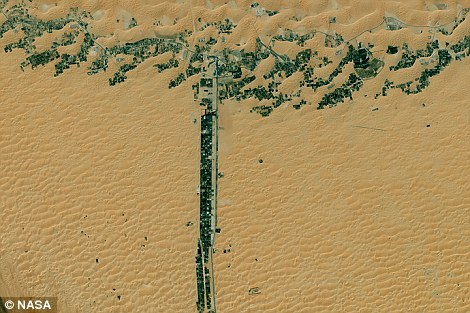 'T': On March 9, 2015, the Operational Land Imager (OLI) on Landsat 8 captured this image of development along two roads in the United Arab Emirates (left). 'U': On May 9, 2004, the Ikonos satellite captured this image of Gooseneck State Park in Utah