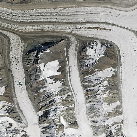 'L': The Moderate Resolution Imaging Spectroradiometer (MODIS) on the Aqua satellite captured this image of snow across the northeastern United States (left). 'K': The Operational Land Imager (OLI) on Landsat 8 captured this image of glaciers in the Tian Shan mountains in northeastern Kyrgyzstan