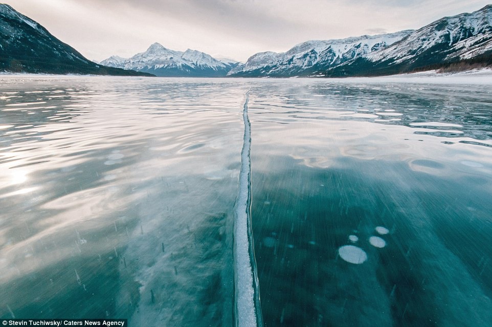 Abraham Lake is an artificial lake on North Saskatchewan River in western Alberta. Dotted beneath the icy surface are methane bubbles