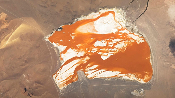 The brightly colored Laguna Colorada, unique in this part of the Bolivian Andes Mountains. (Photo/NASA)