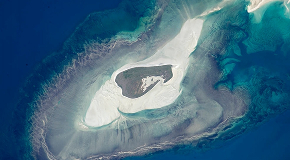 A tiny island with many concentric zones around it. Adele Island, off Australia’s north coast. (Photo/NASA)