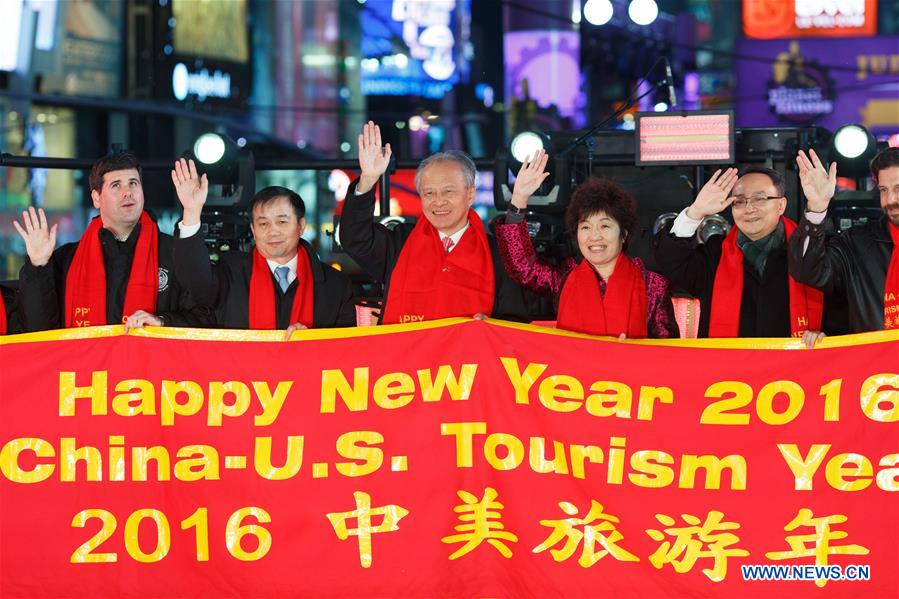 Chinese Ambassador to the United States Cui Tiankai (3rd L) and Chinese Consul General in New York Zhang Qiyue (3rd R) attend the opening ceremony of the New Year's Eve celebration at the Times Square in New York Dec. 31, 2015. [Photo: Xinhua]