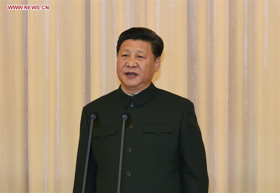 Chinese President Xi Jinping addresses the founding ceremony of the general commands of the Army, Rocket Force and Strategic Support Force of the Chinese People's Liberation Army (PLA) in Beijing, capital of China, Dec. 31, 2015. The general commands of the PLA Army, Rocket Force and Strategic Support Force were founded on Thursday. (Xinhua/Li Gang)