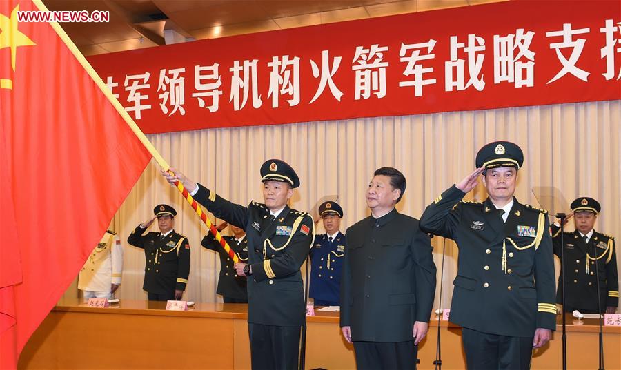 Chinese President Xi Jinping (C F) confers the military flag to Gao Jin (L F), commander of the Strategic Support Force of the Chinese People's Liberation Army (PLA), and Liu Fulian (R F), political commissar of the Strategic Support Force, in Beijing, capital of China, Dec. 31, 2015. The general commands of the PLA Army, Rocket Force and Strategic Support Force were founded on Thursday. (Xinhua/Li Gang)