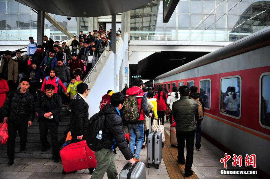 Passengers board a train at a railway station in Yunnan's capital, Kunming on January 1, 2016. [Photo: Chinanews.com]