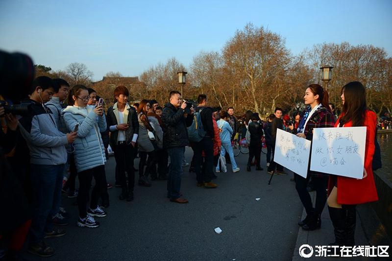 "Rent me as your girlfriend!" - Two beautiful women held a banner near the West Lake in Hangzhou, east China's Zhejiang province on Jan. 2, 2016. They said they are single college students and are willing to offer accompany services as a girlfriend in spare time. They were surrounded by the curious passers-by. Some said it was just a show. (Photo/Zjol)