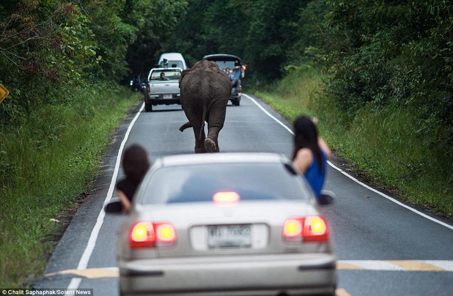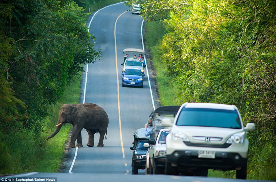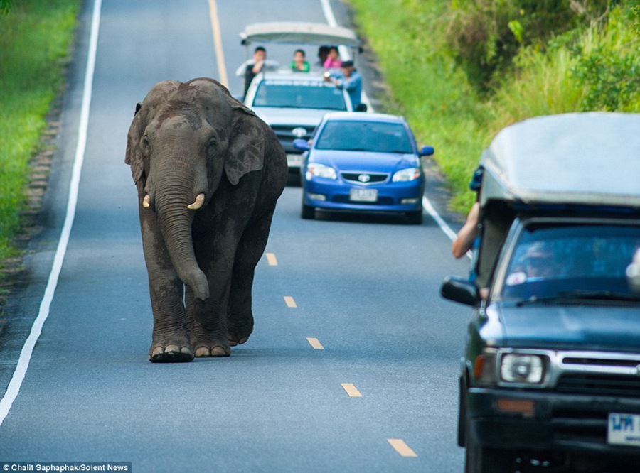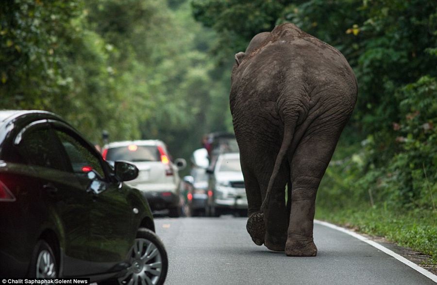 Photographer Chalit Saphaphak, 30, of Suphanburi, Thailand, said: 'The elephant was on his own. He was in the road and holding up traffic for an hour.