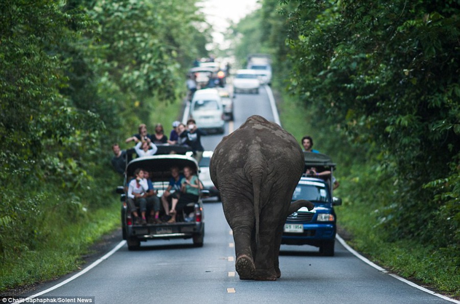 The male Asian elephant held up vehicles for around an hour as he made his way along the long road in Khao Yai National Park, in Thailand.