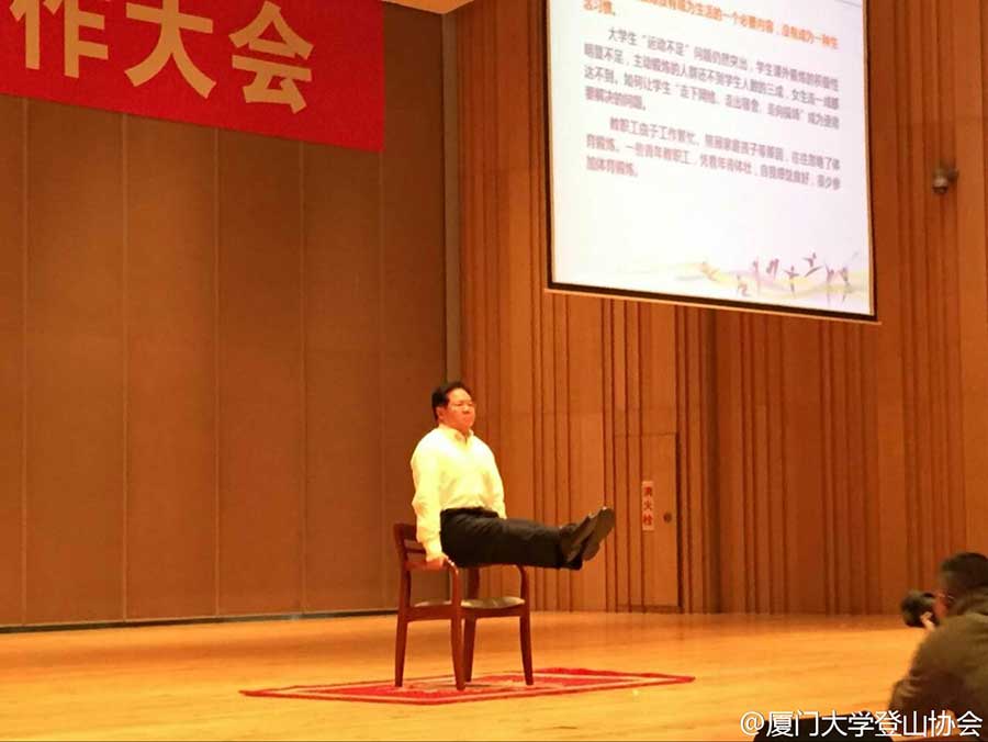 A photo of the President of Xiamen University went viral on social media recently. In this photo, Zhu Chongshi, 61, grasps the arms of a chair and raises his legs until they are parallel to the ground. He kept the pose for 25 seconds, which got many likes, according to the Weibo of Xiamen University Mountaineering Association on Jan. 10. Zhu did this during a meeting to encourage students and faculty to take more physical exercise, says the post.