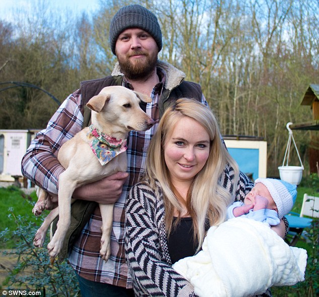 Angela and Ian Szczypka with baby Tobias and Indy the dog, who has had wheels fitted to help her get around