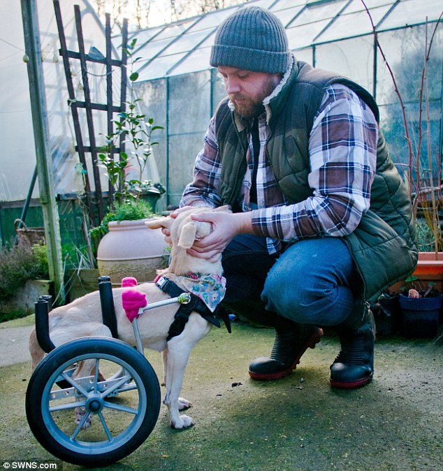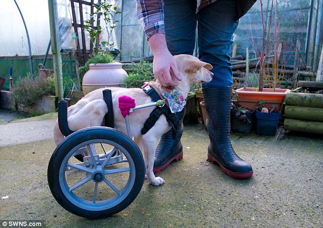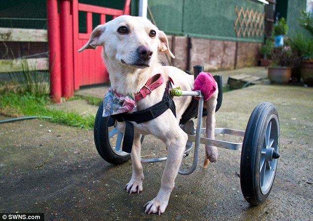 She said: 'A man in Kent made us a wheelchair for £300. He's amazing. He makes ski wheelchairs for dogs in Sweden, and for dogs all over the world. It took a while to get it made because Indy's got a funny body shape. She's a bit like a seal when she walks.