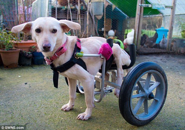 Happy days: Nine months after the couple met Indy and decided to adopt her, the puppy arrived in the UK and was given a specially made 'wheelchair'