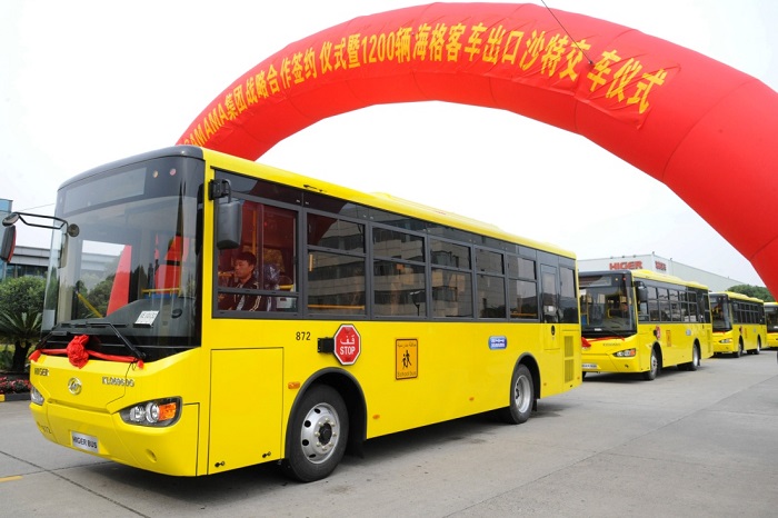 Higer, a Chinese bus manufacturer, holds ceremony for strategic agreement signing and delivery of 1,200 school buses with Saudi Arabian clients in Suzhou, Higer's manufacturing plant. (Photo: Xinhua )