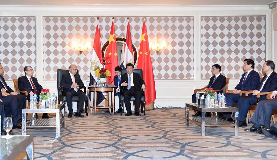 Chinese President Xi Jinping (R back) meets with Egyptian Prime Minister Sherif Ismail (L back) in Cairo, Egypt, January 20, 2016. (Xinhua/Zhang Duo)