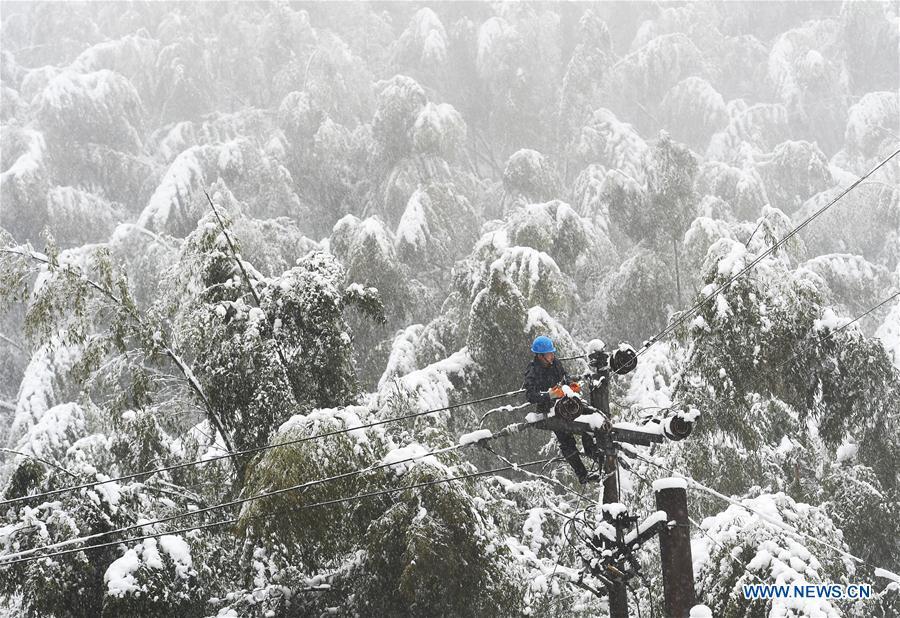 An electrician of local power grid tries to restore power supply in Xiaoshan district of Hangzhou, capital of east China's Zhejiang Province, on January 21, 2016. China's National Meteorological Center (NMC) announced a warning Thursday morning for snowstorms in southern China. [Photo: Xinhua/Huang Zongzhi]