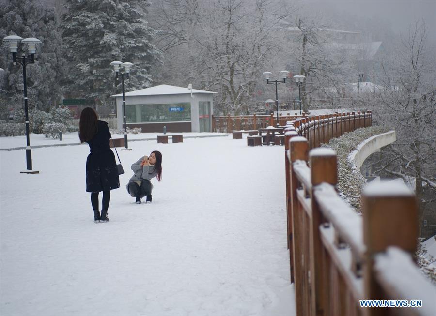Tourists pose for photos at Lushan Mountain scenic spot in east China's Jiangxi Province, on January 21, 2016. China's National Meteorological Center (NMC) announced a warning Thursday morning for snowstorms in southern China. [Photo: Xinhua/Hu Chenhuan]