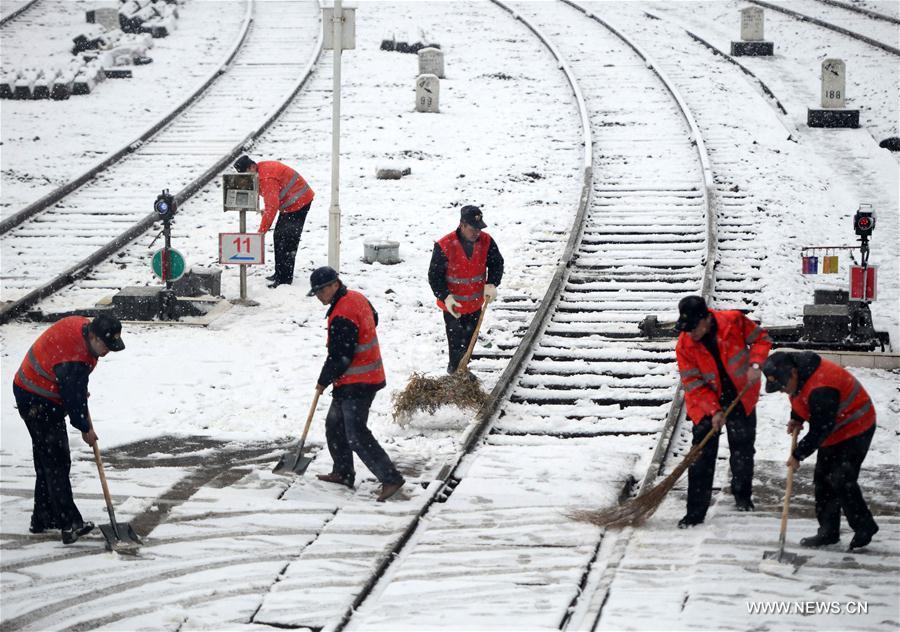 Workers clean snow on the railways in Jiujiang, east China's Jiangxi Province, on January 21, 2016. Jiangxi Meteorological Bureau released blizzard blue warning on Thursday. Nanchang Railway Bureau launched the contingency plan to deal with the bad weather and secure the transportation. [Photo: Xinhua/Hu Guolin]