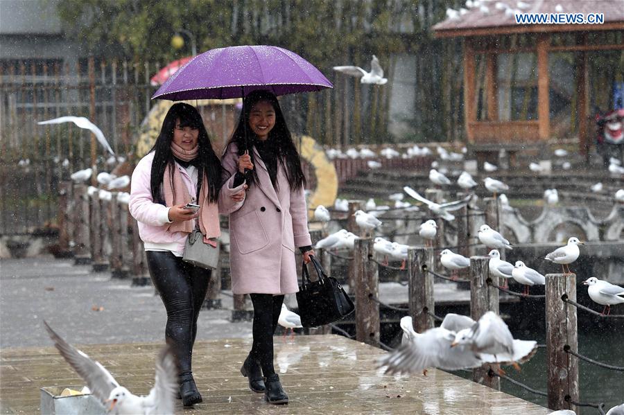 Two girls walk in snow and rain in Kunming, known as the Spring City, in southwest China's Yunnan Province on Jan. 23, 2016. Snow hit the city on Friday and the temperature dropped dramatically due to cold front from the north. (Xinhua/Lin Yiguang)