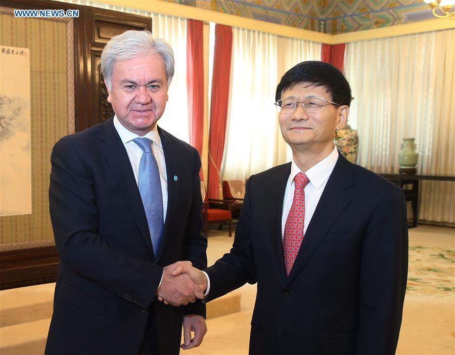 Meng Jianzhu (R), a member of the Political Bureau of the Central Committee of the Communist Party of China (CPC) and head of the Commission for Political and Legal Affairs of the CPC Central Committee, meets with Rashid Olimov, new Secretary-General of the Shanghai Cooperation Organization (SCO), in Beijing, capital of China, Jan. 27, 2016. (Xinhua/Yao Dawei)