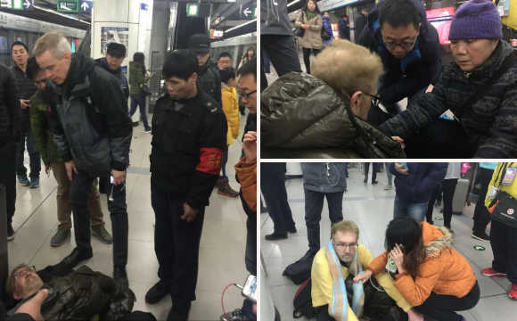 At about 9 a.m., the foreigner suddenly fainted and fell on the ground in the Taiyanggong Station of Subway Line 10.