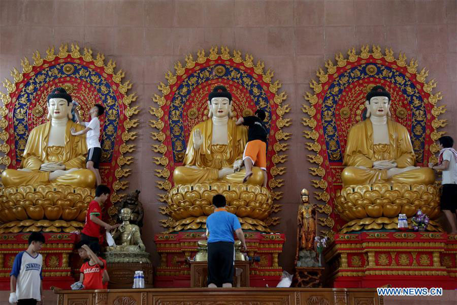 Workers clean the statues of Buddha to prepare for the celebration of the Chinese Lunar New Year in Palembang, Indonesia, Jan. 31, 2016. [Photo: Xinhua/Nova]