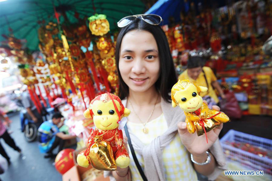 A Thai woman shows monkey dolls in front of a decoration shop at China Town in Bangkok, Thailand, Feb. 1, 2016. [Photo: Xinhua/Rachen Sageamsak]