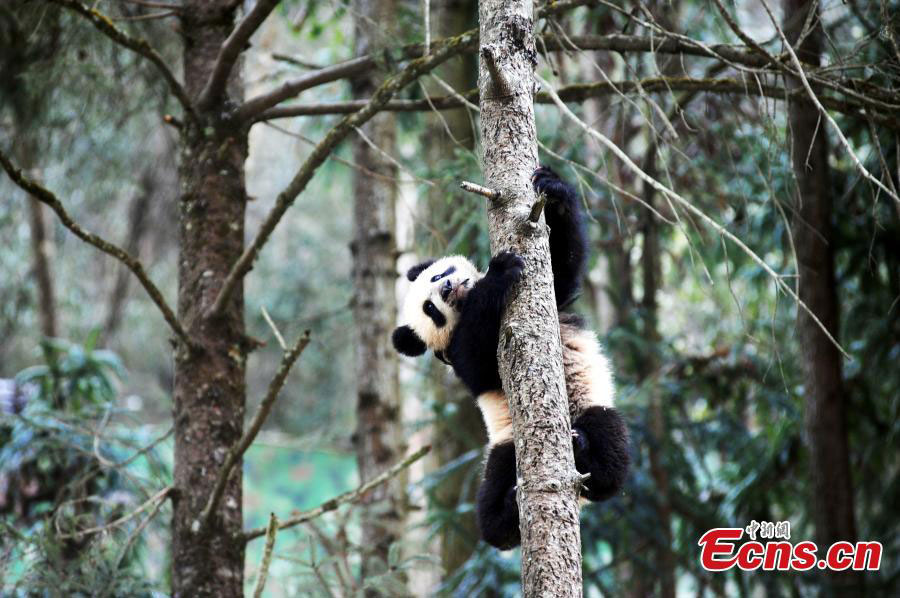 A giant panda plays at the Hetaoping base of the China Conservation and Research Center for the Giant Panda at the Wolong Nature Reserve in Southwest China’s Sichuan Province. Three panda cubs born in 2015 will be trained at the base before returning to the wild. [Photo: Chinanews.com/Qiu Yu]