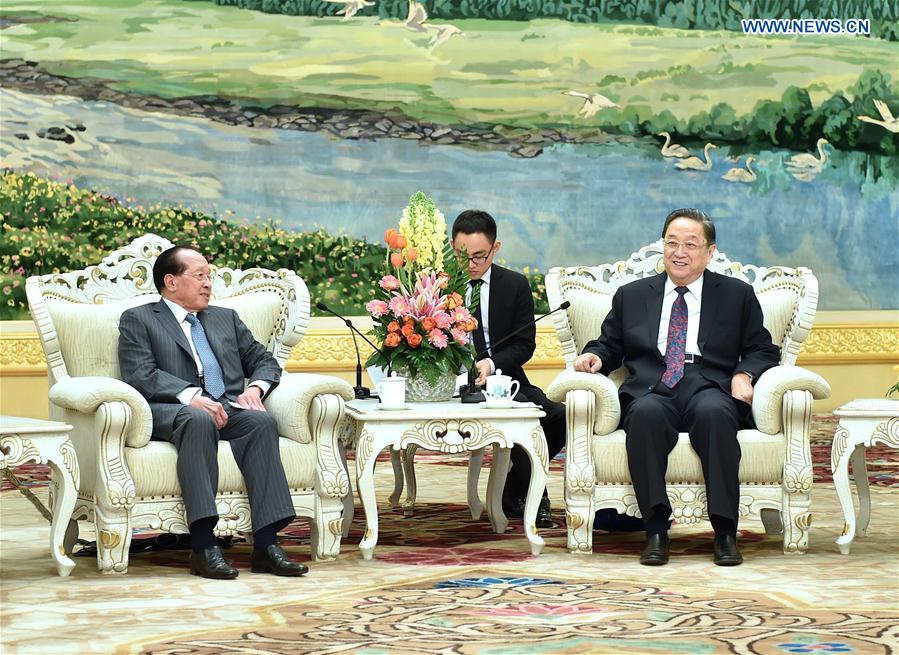 BEIJING, Feb. 4, 2016 -- Yu Zhengsheng (1st R), chairman of the National Committee of the Chinese People's Political Consultative Conference, meets with Cambodian Deputy Prime Minister Hor Namhong (1st L) in Beijing, capital of China, Feb. 4, 2016. (Xinhua/Li Tao)
