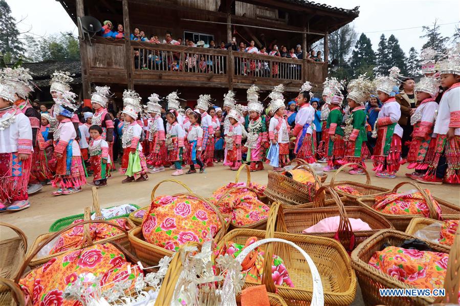 People of Miao ethnic group dance to celebrate the Spring Festival in Rongjiang County, southwest China's Guizhou Province, Feb. 11, 2016. (Xinhua/Li Changhua)