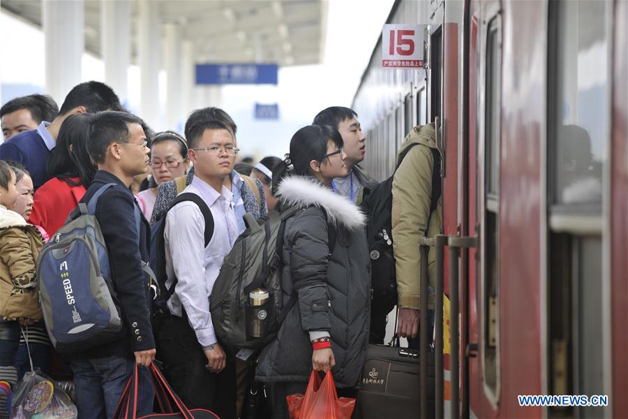 Passengers prepare to get on a train at the railway station of Yudu County, east China's Jiangxi Province, Feb. 12, 2016. Railway stations around the nation witnessed surging passenger flows on Friday as the Spring Festival came to the end and people started to return to school and work. (Xinhua/Wang Wei)