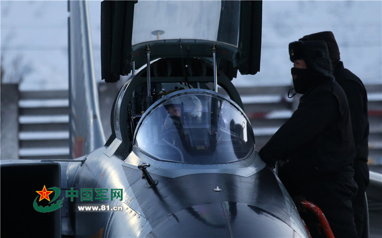 Airmen perform preflight inspection on a JH-7 fighter bomber before flight training. A PLA Air Force aviation brigade stationed in northwest China’s Xinjiang Uygur Autonomous Region recently conducted round-the-clock flight training in a frigid environment of 21 degrees below zero at the north foot of Tianshan Mountain.