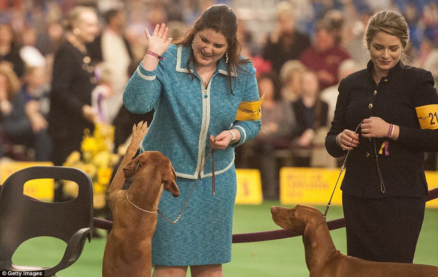 Lindsay Fetters gives her Vizsla a high five after it won best of breed in the first round of competition on the second day of the dog show