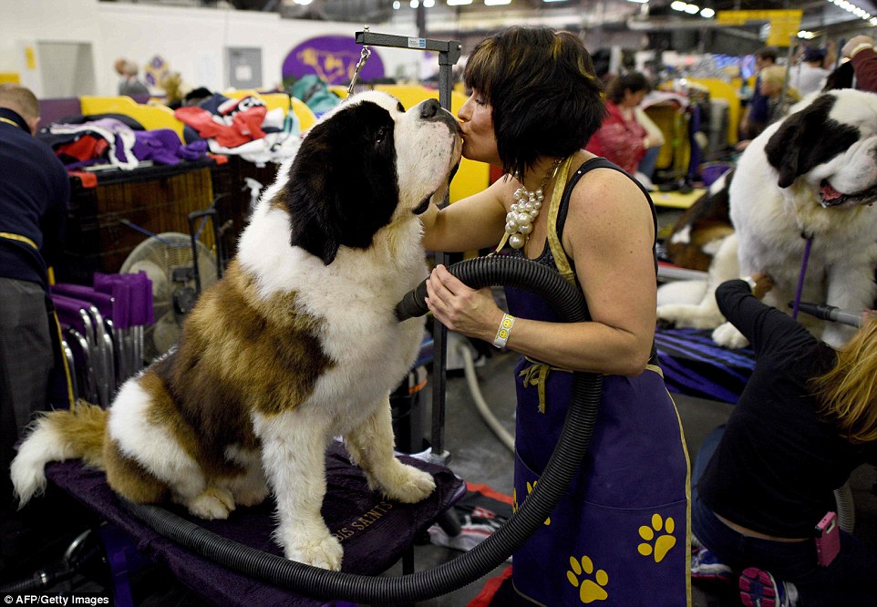 Saint Bernard is seen in the grooming area on Tuesday steeling a smooch from its owner on day two of the competition in New York