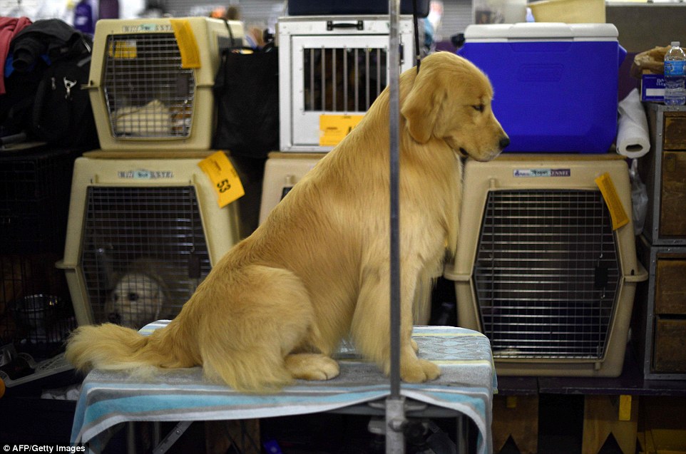 A Golden Retriever dries out in the grooming area on the second day of the Westminster Kennel Club Dog Show